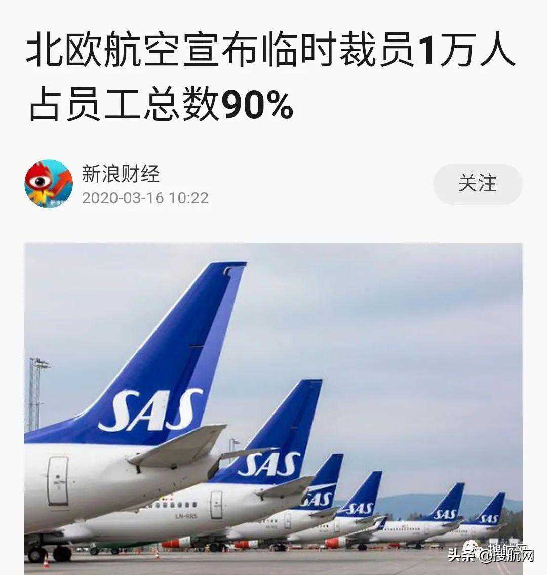 据搜航网获悉,北欧航空公司(ScandinavianAirlines)在当地时间上周日晚紧急公告,该公司将于3月16日停运大部分航班,直到因疫情受重创的商用航空环境得到改善。