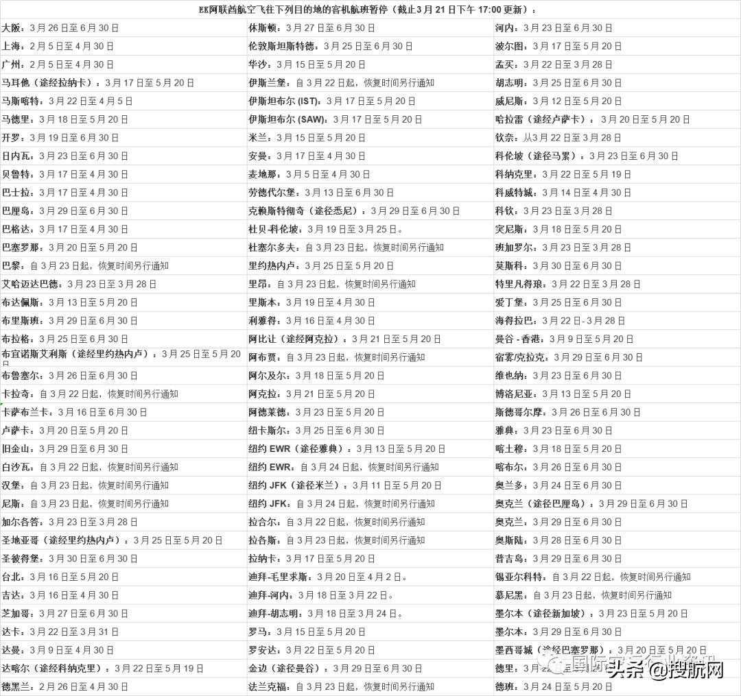 昨天,航空业关于“阿联酋航空停飞100多个目的地”的信息再次让业界震惊,其实不仅阿联酋航空,土耳其航空,卡塔尔航空等多家航空公司给出的停航统计表都长到天际了。
