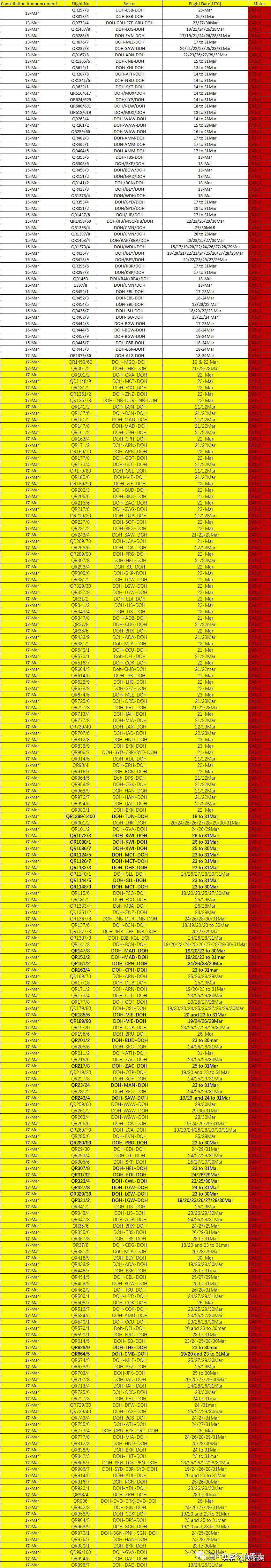 QR卡塔尔航空客机航班取消情况