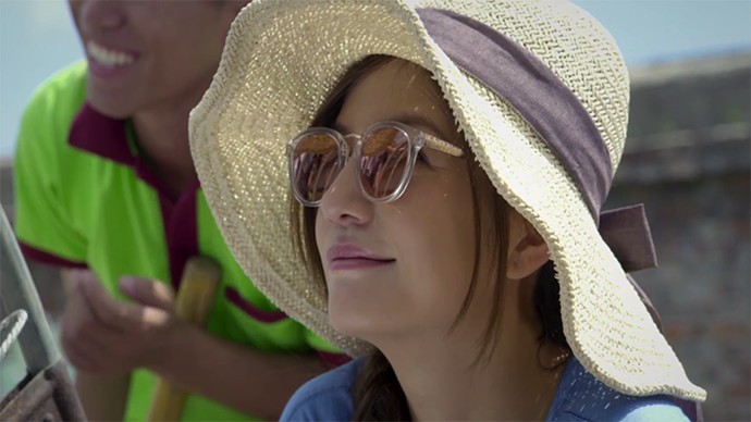 蓝片太阳镜的清爽再适合夏天不过,可以像超模Gigi一样,白色衣物搭配尤其好看。