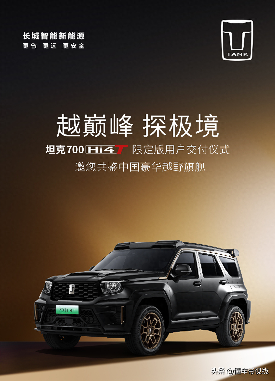 [懂车帝原创产品]日前,我们从官方获悉,坦克700Hi4-T正式开启交付。作为一款中大型越野SUV,坦克700Hi4-T搭载由3.0TV6发动机和P2电机组成的插电混动系统,匹配9挡混动专用变速箱,并且配备前后差速锁,极境版和首发限定版还配备了电子可断开式稳定杆、空气悬架和CDC可调阻尼减振系统。目前,该车共有3款配置车型在售,极致版和极境版价格分别为42.8万元和46.8万元,每年限量发售700辆的限定版车型售价为70万元。