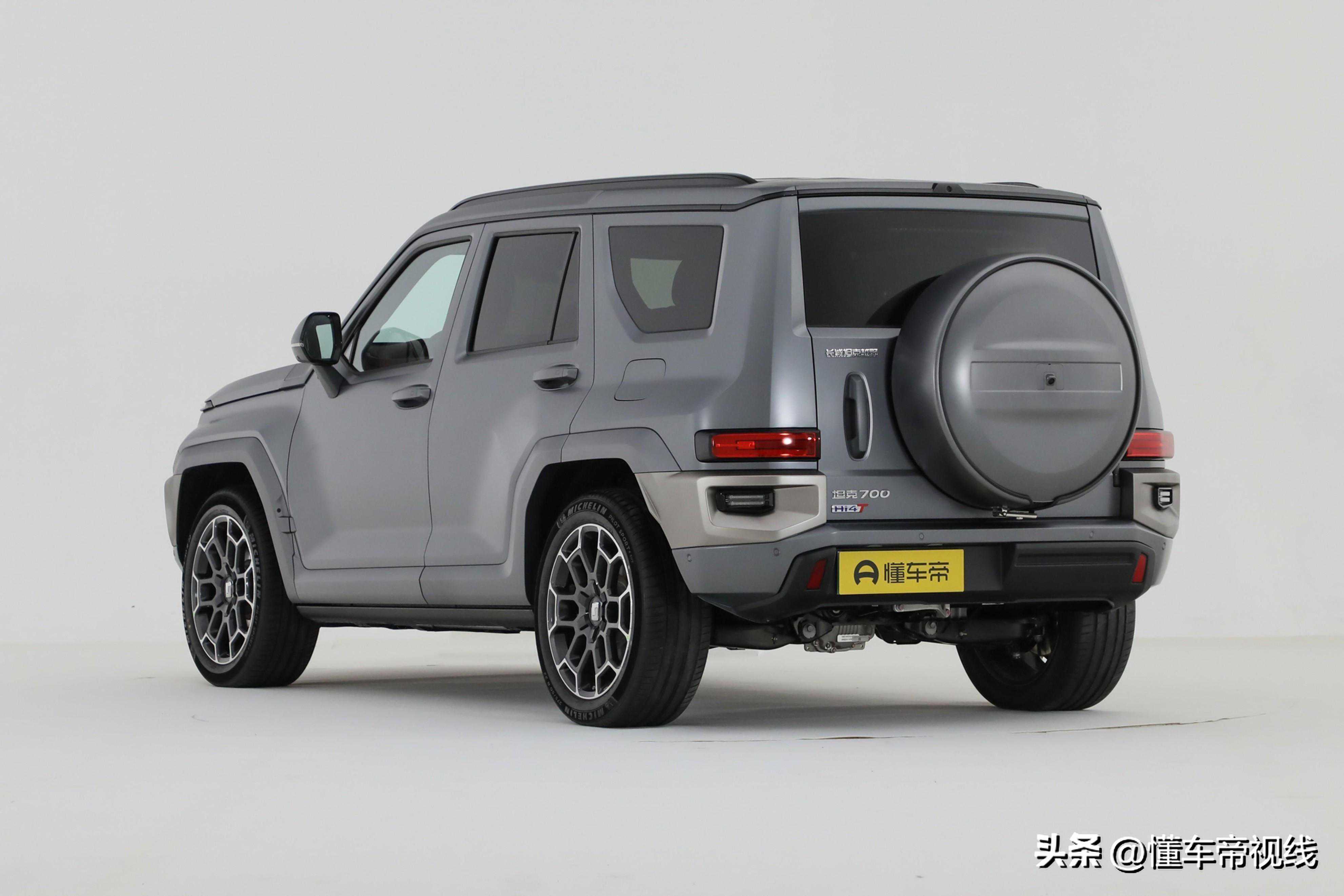 坦克700Hi4-T极致版和极境版车尾配备外挂式备胎,并会配备标配电动侧踏、电吸后尾门、前风挡迎宾灯等配置,还提供前绞盘、后电动拖车钩、拖车取电口选装,也预留了原厂竞技杠改装空间,也避免了后期第三方加装竞技杠切割保险杠的麻烦。