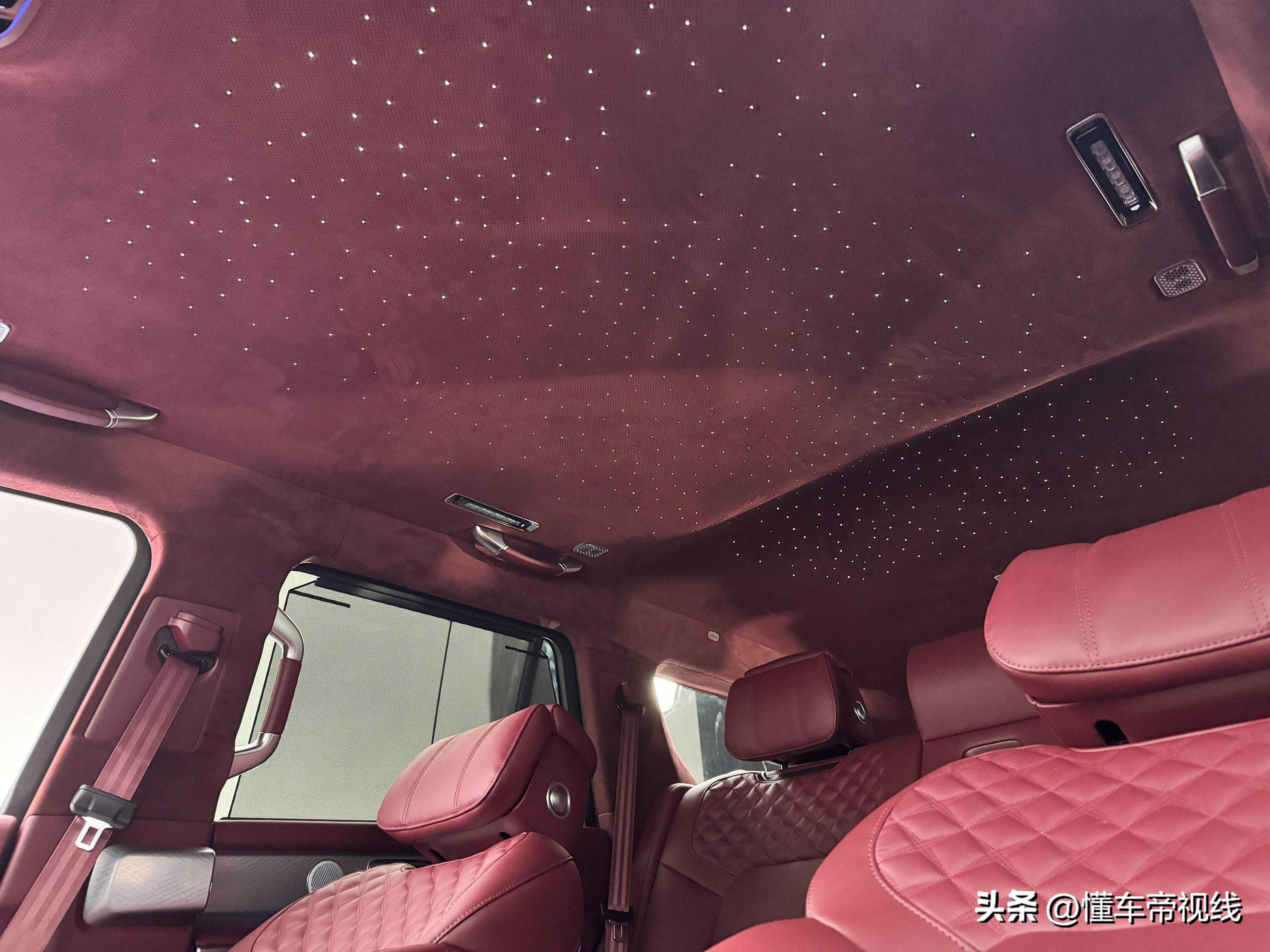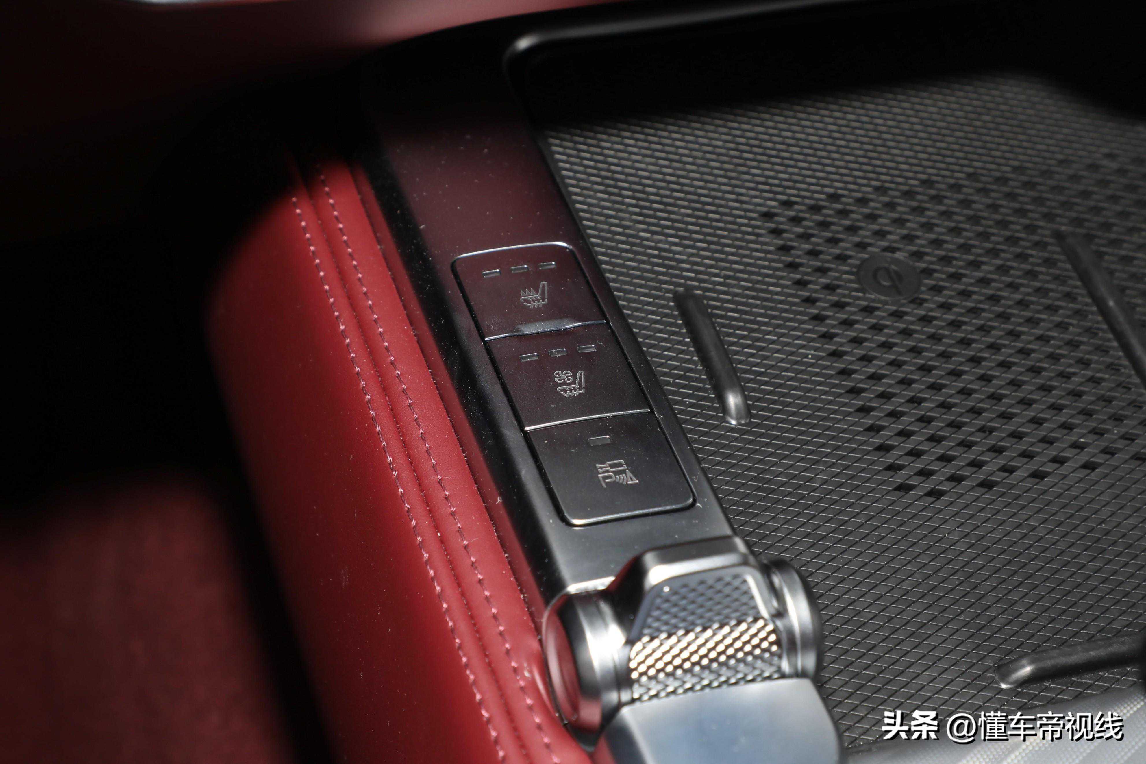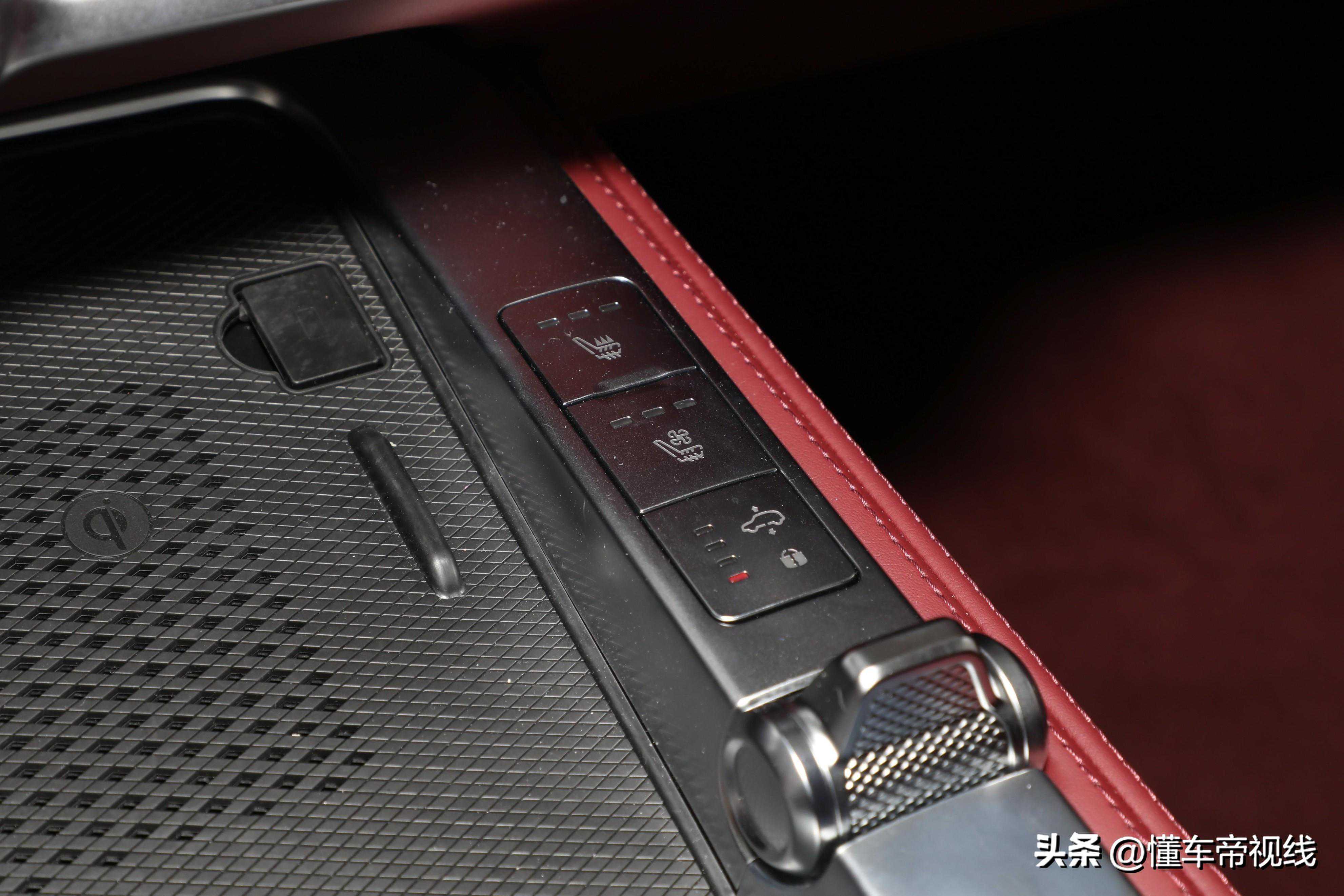 副仪表台区域前方为2个最大功率50瓦的手机无线充电面板,两侧除了控制座椅通风、加热的实体按键外,还配备了两个拨杆,左侧用来切换驾驶模式,右侧则是调整空气悬架高度。极境版和极致版带有可开启电动天窗,而首发限定版则配备了星空顶。