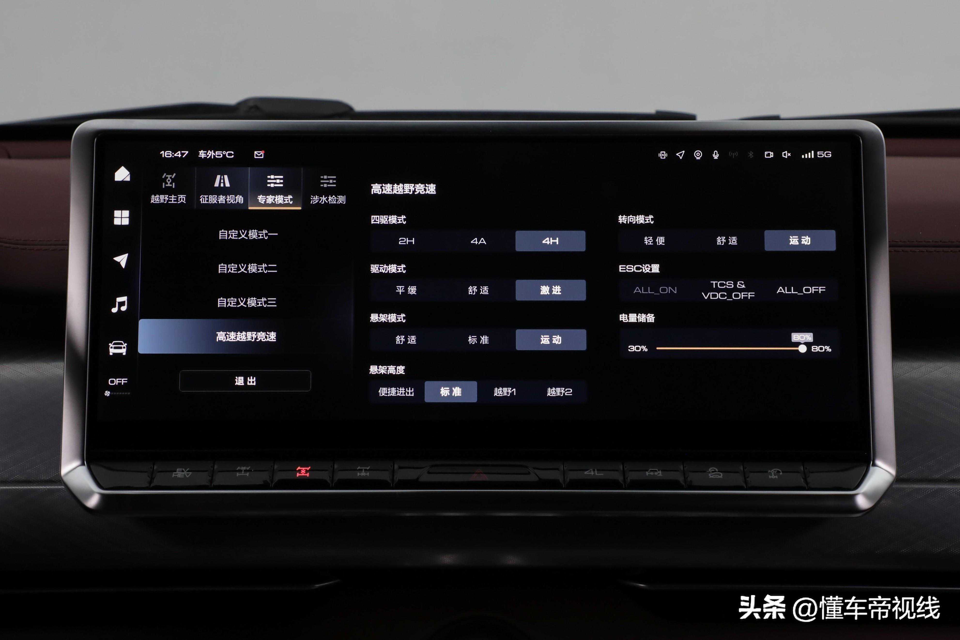 坦克700Hi4-T极境版还配备了空气悬架和CDC可调阻尼减振系统,其中空气悬架升降行程为120毫米(升70毫米,降50毫米),并提供6档可调,包括便捷进出(降50毫米)、运动模式(降20毫米)、标准模式、沙地/雪地等模式(升40毫米)、低速四驱(升60毫米)、涉水模式(升70毫米)。