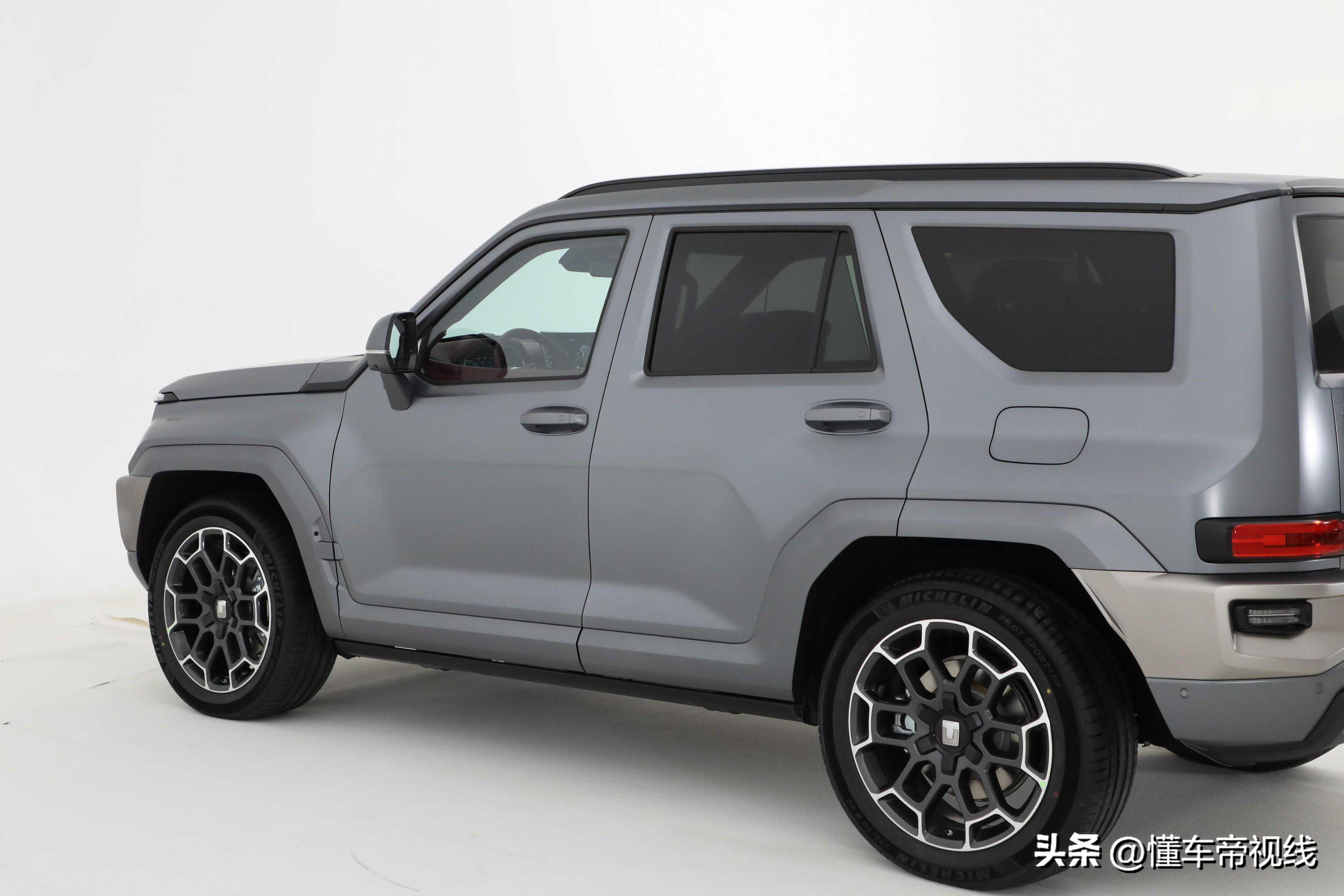 从侧面看,坦克700Hi4-T呈现出较为明显的硬派风格,前后包围呈现出宽体的视觉效果,三扇侧窗则均采用不规则造型设计,还配备电动侧踏。极致版和极境版配备20英寸轮辋,提供22英寸轮辋选装,长宽高分别为5090/2061/1952毫米,轴距为3000毫米。