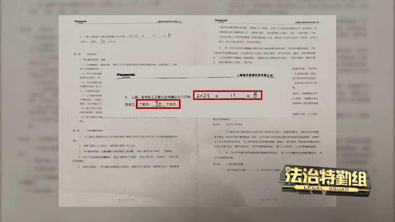 除了质量问题外,原本应该在去年11月就完工的屋子,整整拖延了3个多月的工期都没完工。在这份封面印有“松下住空间”品牌LOGO的装修施工合同中明确写明,王阿姨家的工期是90个工作日,竣工日期为2023年11月8月。