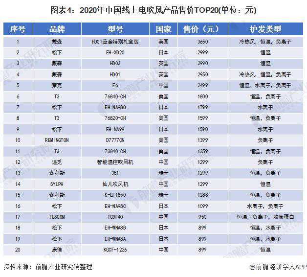 根据奥维云网《2020电吹风市场分析报告》,2020年1-8月,国内线上电吹风销量前5名分别是:飞科、康夫、闪格、松下、飞利浦,但均价较低,仅在50元-400元之间。