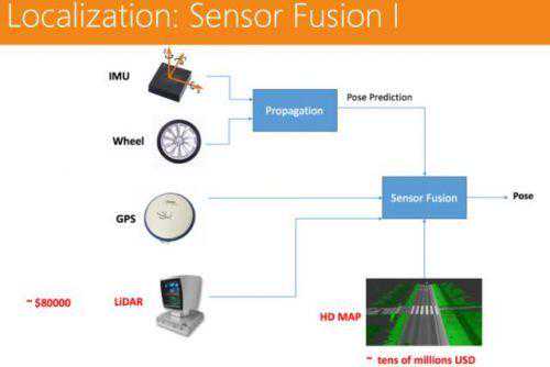 但是激光雷达的成本高,而且是转动的形式,容易磨损,耐用性很差。激光雷达很依赖另一个传感器——高精地图(传统意义上也不能称其为传感器),二者配合使用才能达到一个很好的定位效果。