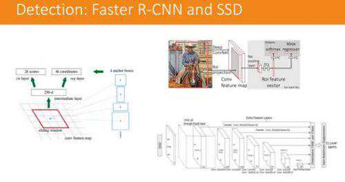 一个是FasterR-CNN,它会将兴趣点框出来,然后再进行物体识别,找到是不是你想要识别的物体;另一个是更为快速的SSD,也是将图中的物体识别出来。