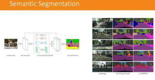 而在场景分类方面,运用深度学习的方法则使用的是另一种模型,被称为PSPnet(语义分割)。这是金字塔型的场景分解模型,将一个场景不断地压缩,把类似的物体聚类,然后再做判断。