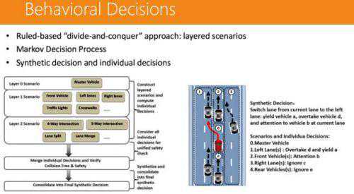 有了全局的路径规划以后,我们就需要进行行为决策。因为道路场景非常复杂,可以分成几十个不同的场景——左右车道、丁字路口等等,需要做场景组合决策。