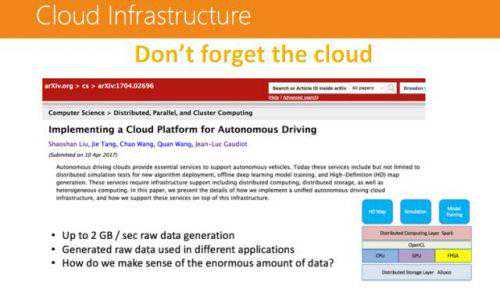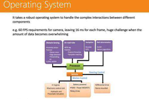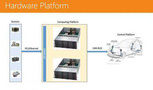 单一主节点,很容易整体崩溃。(解决方案:可以用Zookeeper机制来做,设置多个主节点。)通信非常低效。(解决方案:可以用共享内存的方法来做。)不是很安全,比如开一个恶意节点不断去损耗资源,很容易造成整体系统的崩溃。(解决方案:这个问题可以使用LinuxContainer的技术来解决。)硬件平台当然也是不可或缺的。其前端有很多传感器,信号传输进来后,有一个计算平台进行接收,处理完成后再通过CAN-BUS,把控制信号传给车辆控制系统。