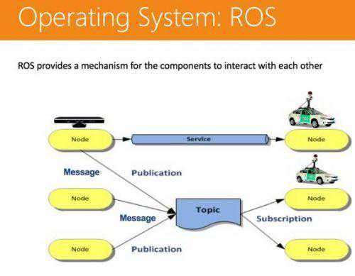 首先我们需要一个操作系统来管理这么多复杂的工作,现在大部分厂家用的都是ROS——机器人操作系统,当然都做了一些个性化设计。这是一个信息传递的系统,可以通过点对点的传输形式或是广播的形式来做信号传输的动作。