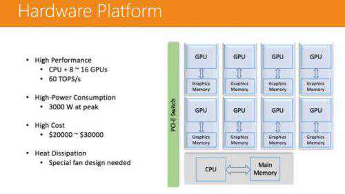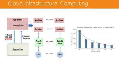 在计算层面,我们运用了ApacheYarn这个分布式系统管理器通过Spark把作业分发下去,每个Spark的节点都有多个容器(Container),容器上会跑一些OpenCL的Kernel,OpenCL可以跑在GPU上,也可以跑在FPGA上。这个平台的可扩展性非常强,模型训练所需的时间会随着GPU数量的增加而线性减少。