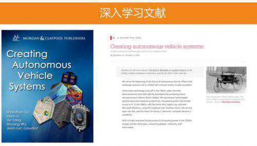 在有了入门的知识并完成入门小作业后,大家会对整个无人驾驶的技术框架比较了解,这个时候就需要更深入的了解每个技术点。为了让读者更深入了解无人驾驶技术,我们花了很多时间梳理了当前无人驾驶使用到的技术点,在美国出版了《CreatingAutonomousVehicleSystems》,这本书被IEEE推荐为无人驾驶教材,已经被美国多个大学的图书馆收录。这本书与《第一本无人驾驶技术书》最大的不同是每个技术点我们会比较深入的去解释,还会提供许多论文的引用,当读者对某个技术点特别感兴趣时,有足够的文献让读者去深入研究。