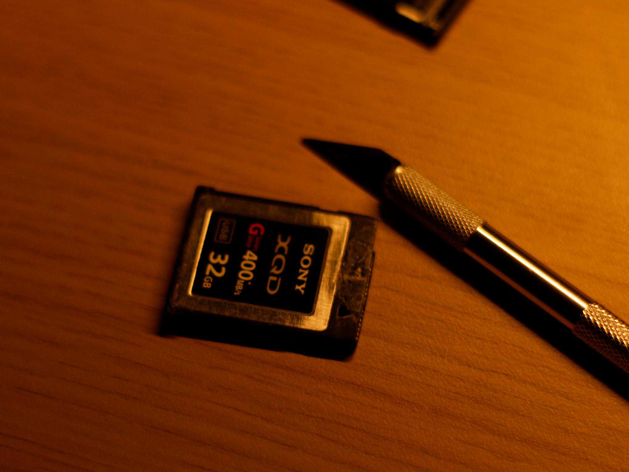 第一步是用刻刀,细心将卡外壳边缘切割开。索尼XQD卡的边缘都是塑料,所以很容易割开。