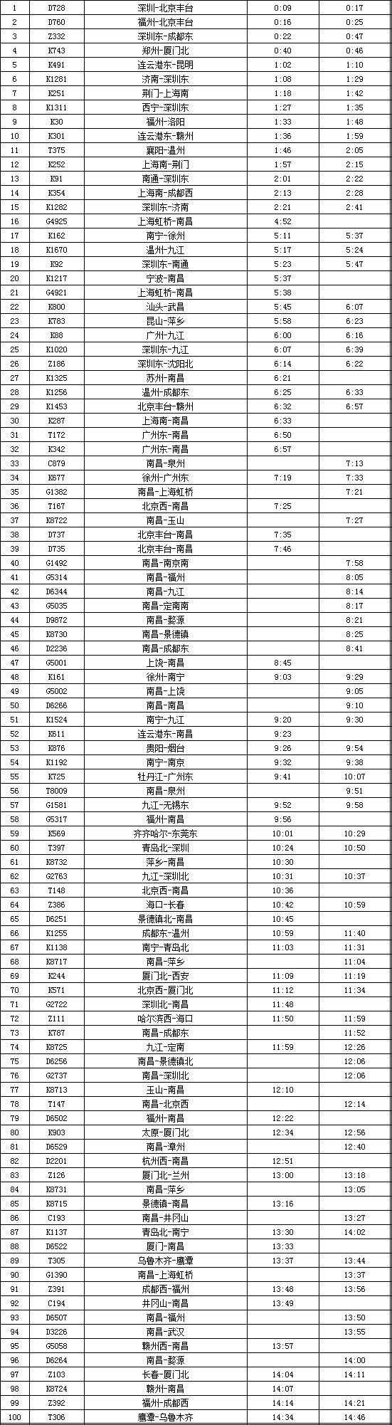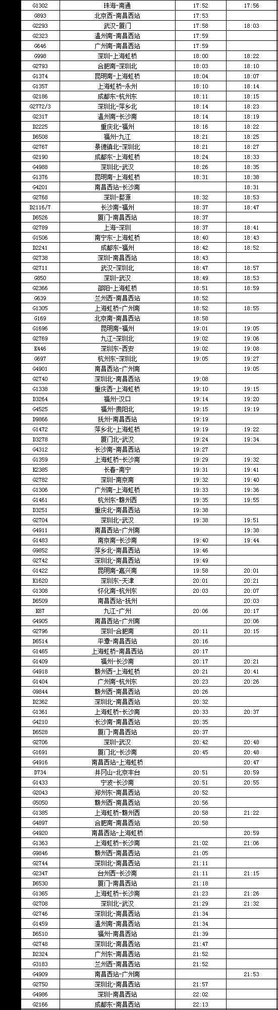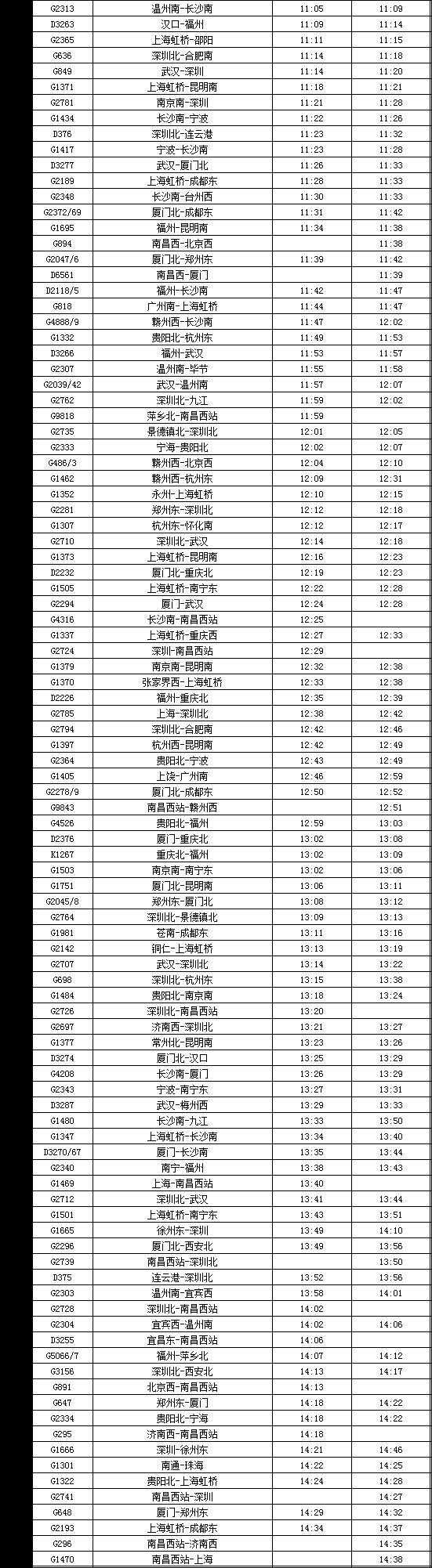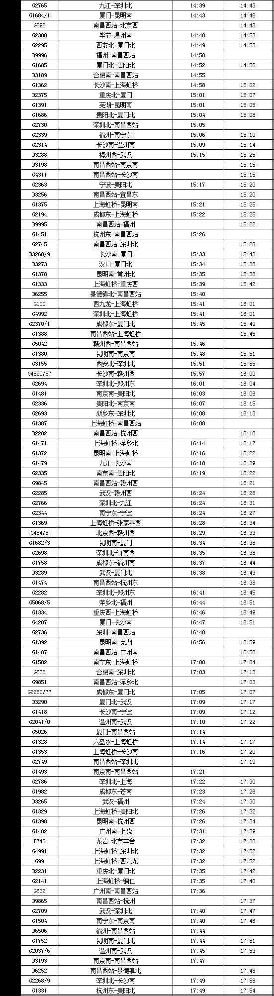 (1)南昌西~深圳北G2735次运行区段延伸至景德镇北~深圳北,延伸区段经由衢九、昌九城际运行;