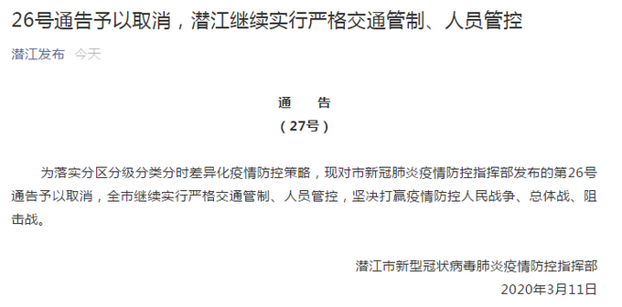 为落实分区分级分类分时差异化疫情防控策略,现对市新冠肺炎疫情防控指挥部发布的第26号通告予以取消,全市继续实行严格交通管制、人员管控,坚决打赢疫情防控人民战争、总体战、阻击战。