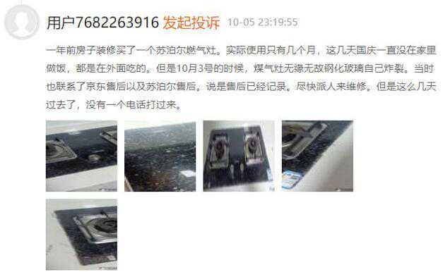 10月5日有消费者投诉称,一年前房子装修买了一个苏泊尔燃气灶。实际使用只有几个月,这几天国庆一直没在家里做饭,都是在外面吃的。但是10月3号的时候,煤气灶无缘无故钢化玻璃自己炸裂。当时也联系了京东售后以及苏泊尔售后。说是售后已经记录。尽快派人来维修。但是这么几天过去了,没有一个电话打过来。