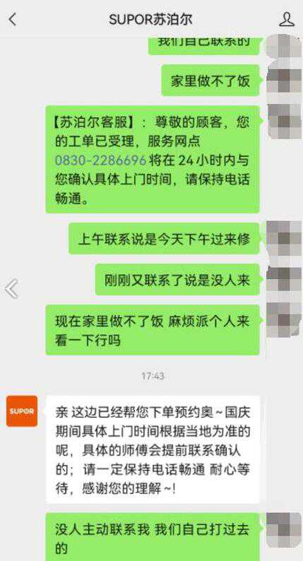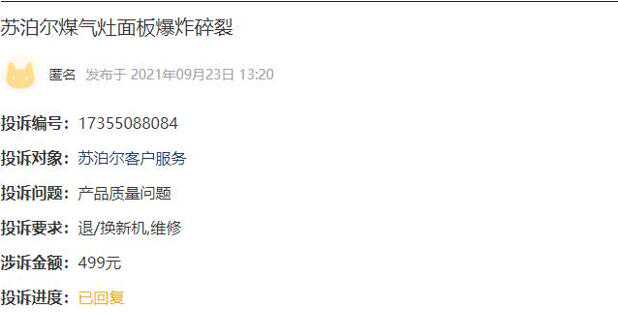 10月9日,也就是今天上午,有消费者投诉称,苏泊尔燃气灶面板炸裂,但是假期内不给维修,今天假期结束第二天,维修也没有处理完成。