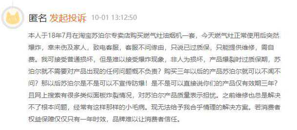 10月1日有消费者投诉称,其于18年7月购买的苏泊尔燃气灶油烟机一套,10月1日燃气灶正常使用后突然爆炸,幸未伤及家人,致电客服,客服不问缘由,只说已过质保,只能提供维修,需自费。