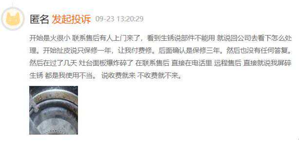 9月23日有消费者在黑猫投诉上表示,其使用的苏泊尔燃气灶出现火焰小的问题,苏泊尔售后上门检查后表示有部件生锈不能用,并表示只保修一年,让该消费者付费维修,后面确认了是保修三年,但没有任何答复,几天后燃气灶面板炸裂,此时售后却表示是该消费者使用不当造成,并称如果同意收费维修就上门,不同意就不来。
