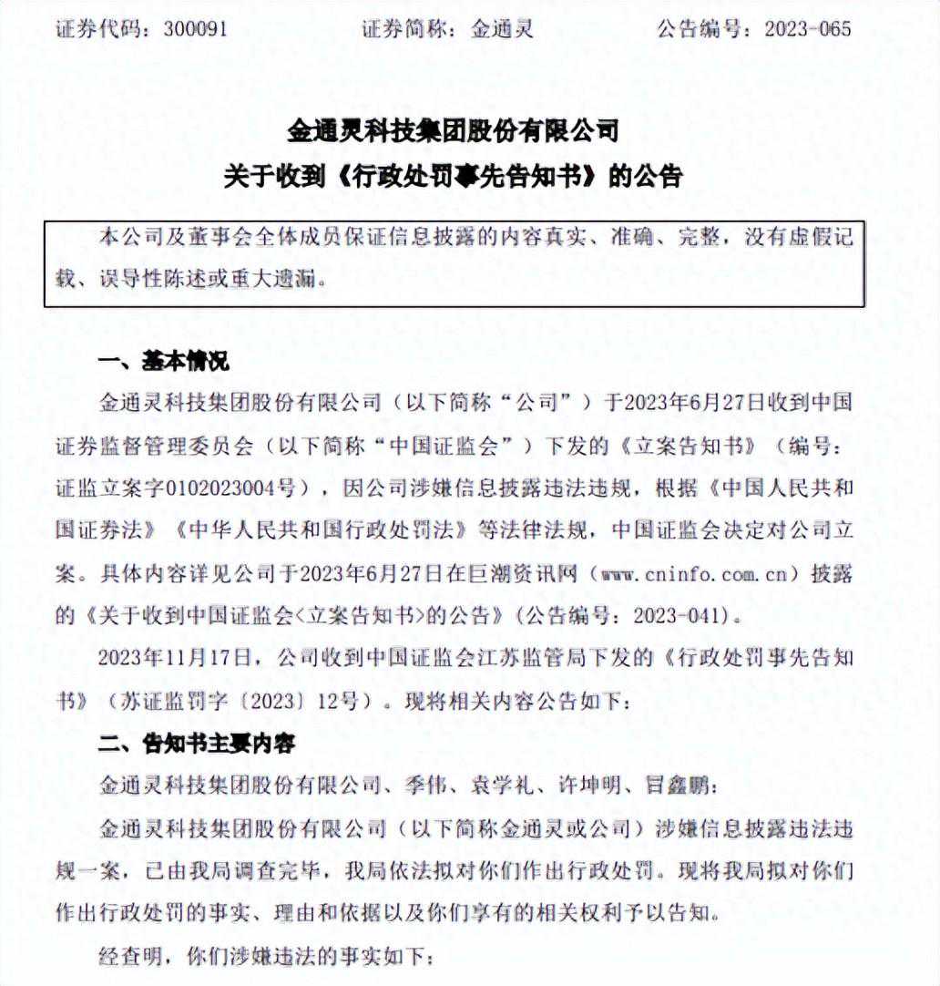 2023年11月17日,金通灵收到中国证监会江苏监管局下发的《行政处罚事先告知书》(苏证监罚字〔2023〕12号)。