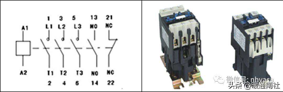 交流接触器工作原理(见图):未接电源时,21和22导通,其余断开;当在A1和A2通上电后,触点系统1-2,3-4,5-6,13-14接通,21-22断开,实现多路控制目的。