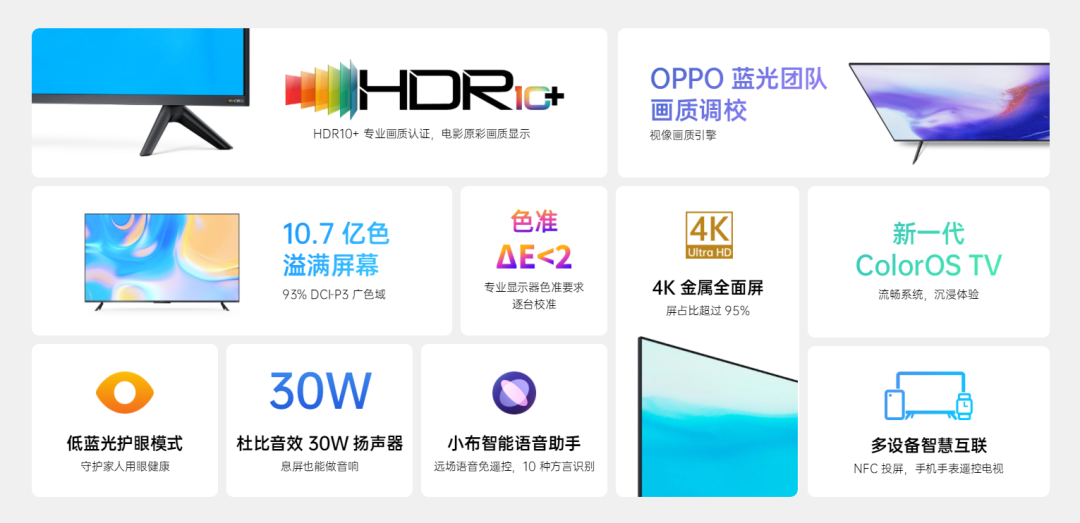 OPPO智能电视K9获得HDR10+显示标准的权威认证,支持低蓝光护眼模式,2*15W大功率腔体扬声器;搭载四核芯片,主频高达1.5GHz,支持双频Wi-Fi;运行新一代ColorOSTV,支持小布智能语音助手。