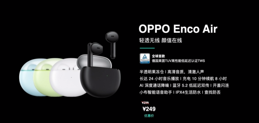 OPPOEncoAir真无线耳机也于活动中亮相,半入耳设计,优惠价249元;OPPOEncoAir灵动版,优惠价149元。