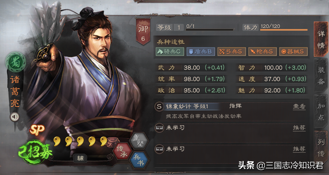 首先,我们来看一下SP诸葛亮的属性和战法机制。属性方面,与经典诸葛亮相比,SP诸葛亮在统帅属性上比经典诸葛亮略有降低(成长值1.79对比2.36),其他属性基本上保持一致,不过这也符合SP诸葛亮作为辅助武将而经典诸葛亮更多做为主将的定位差异。缺点是SP诸葛亮作为主将的抗揍特性降低了不少,不过如果搭配夺魂挟魄或者其他免伤战法可以一定程度减小这个损失。