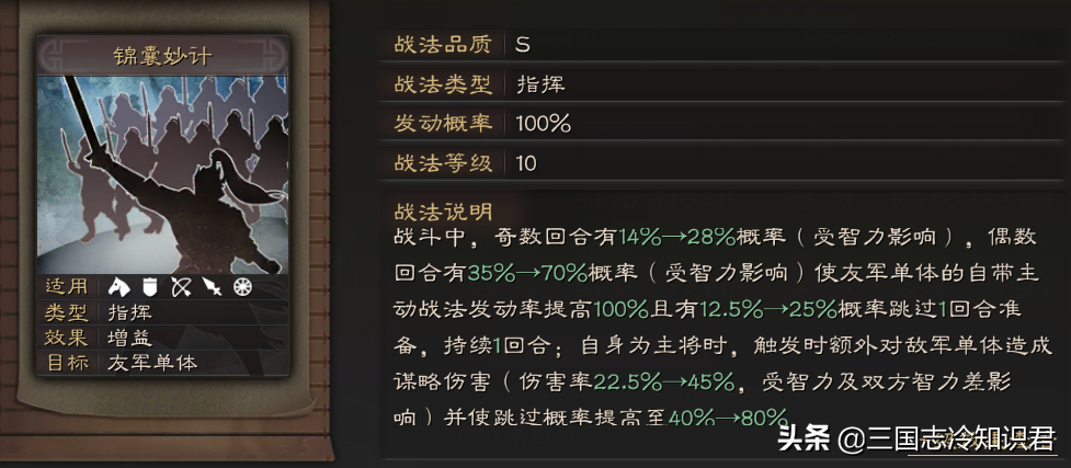 而SP诸葛亮的自带战法每回合有一定概率让友军单体的自带战法发动率提升100%(奇数回合概率低,偶数回合概率高),其实简单理解就是帮助友军单体发动一次自带战法,并且能够有几率跳过一回合准备,这是妥妥的辅助战法。自身为主将时跳过概率可以高达80%,应该说对于蜀国阵容中自带准备主动战法的队友来说帮助很大(特别是发动概率=40%的战法),比如庞统,关羽,黄忠。即便自带瞬发战法的武将,也可以把原先很低的发动率直接提升,比如同为西蜀之智缘分的法正和徐庶,自带战法的发动率也都只有35%。