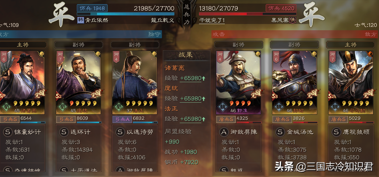 除了上述蜀国阵营的主流配将思路外,三冷君认为SP诸葛亮与其他阵营的武将配合,作为三势阵中的副将存在,可以进一步提升三势阵主将的战法发动概率。同样这种配将思路也需要另外两名武将的自带战法为主动战法,例如吕布,张角,吕玲绮,程昱,王双,邓艾,钟会,庞德,张春华等等。这里提供一种配将思路供各位主公参考: