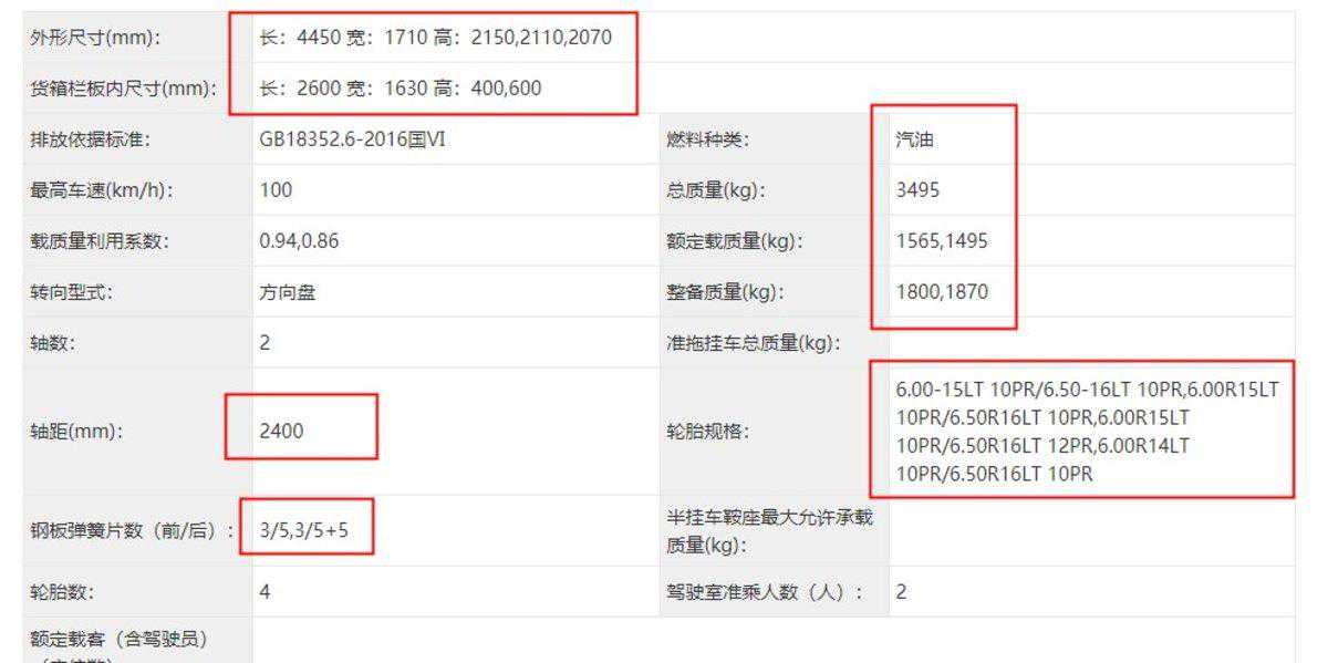 上图这台时风风顺的货厢内宽达到1730mm,车辆轴距为2600mm,总质量4490kg,整备质量2620kg,额定载质量1860,1740kg。