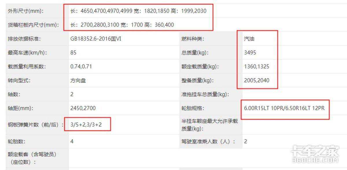 接下来再看看搭载汽油发动机的福田小金刚,同样提供单排、排半以及双排驾驶室。这三款产品的货厢内宽变为了1700mm,总质量为3495kg,底盘板簧片数3/5+2,3/3+2,后轮配备6.00R15LT10PR/6.50R16LT12PR规格轮胎。