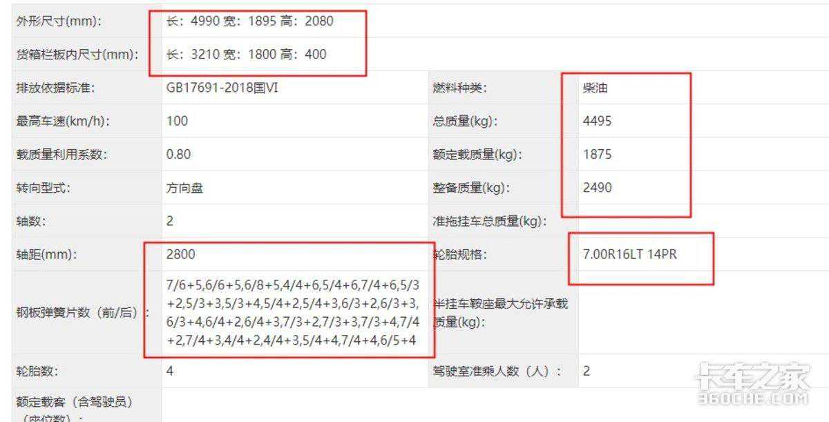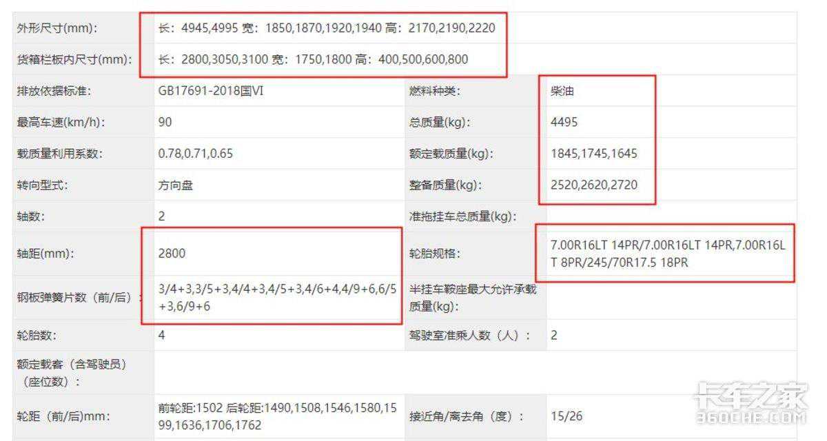 此次,福田小金刚公示的产品仍然比较多,有汽油和柴油两种动力,按照驾驶室又有单排、排半以及双排多款驾驶室。首先来看柴油动力产品,无论是单排还是双排、排半驾驶室,三款产品的货厢内宽都为1800mm,总质量也都是4.495吨,板簧数量为8/8+5,后单胎则是6.00R15LT10PR/235/75规格。