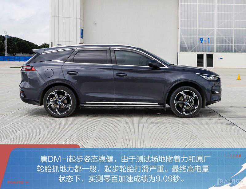 在高电量状态下,唐DM-i实测零百加速成绩为9.09秒。由于我们测试的场地相比柏油路面附着力要稍微差一点,同时唐DM-i原厂匹配的佳通Comfort225轮胎偏舒适取向,抓地力也一般,起步时出现持续的烧胎,一定程度上影响加速成绩。不过9.09秒的成绩,也只是比官方的8.5秒慢了半秒而已。