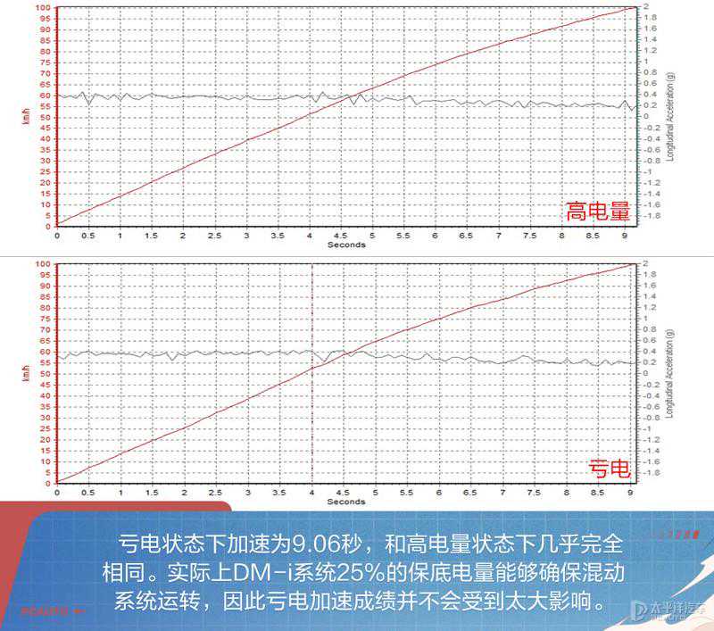 而在亏电状态下,唐DM-i实测零百成绩为9.06秒,和高电量状态下几乎完全相同。实际上DM-i系统在纯电模式无法开启的时候,电池里依然保留了25%的电量,这部分电量能够确保混动系统的运转,因此亏电时加速成绩并不会受到太大影响。