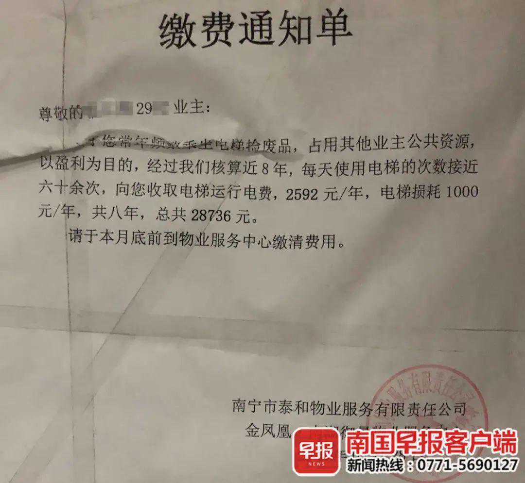 近日,南宁一则特别的物业缴费通知单引发热议,一业主近8年频繁乘坐电梯捡垃圾,被物管催收近3万元费用。