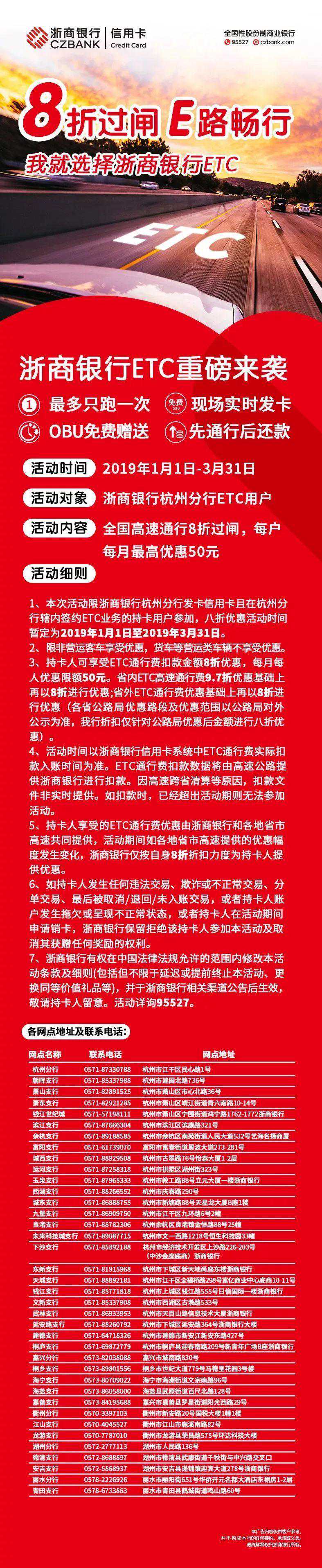 2019年1月1日至3月31日,享受全国高速公路过闸费折上八折优惠(公路局原有ETC折扣基础上再打八折,每人每月50元封顶)