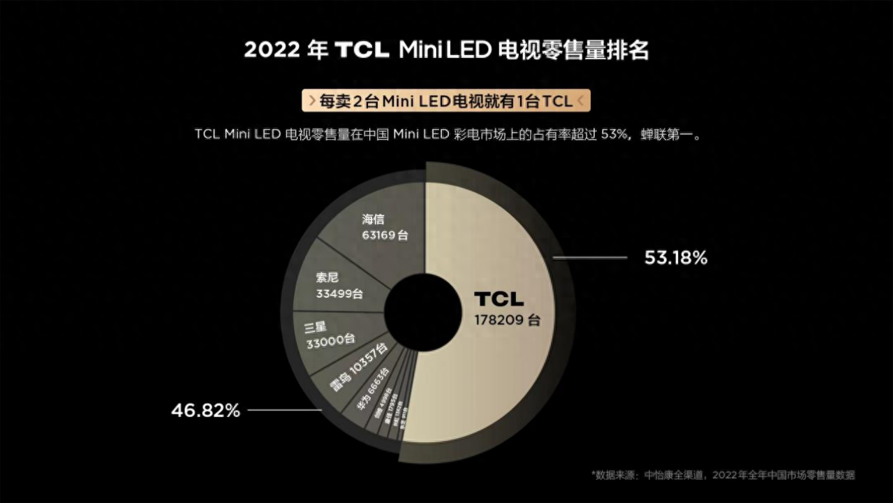 来自第三方数据显示,2022年,在国内MiniLED电视市场,TCL的市占率竟然高达53%,换句话说,平均每卖出两台MiniLED电视,就有一台来自TCL。