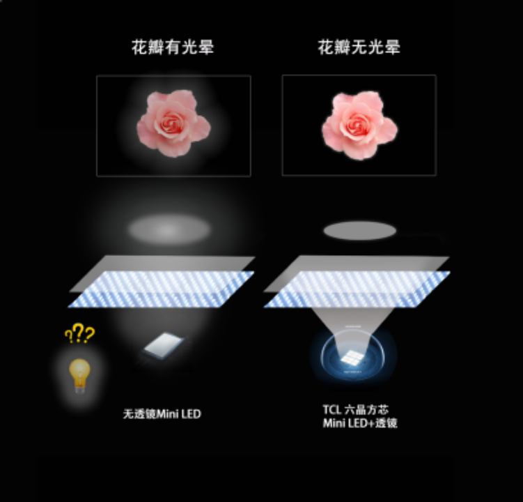 就比如,在一些有纯黑画面的图片展示时,传统MiniLED显示的黑色画面并不纯净,特别是接近色彩的部分,会有明显的光晕,这是因为无透镜技术的MiniLED容易让分区内的光外溢到其他分区,点亮其他分区,导致光晕产生。
