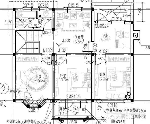 二层别墅设计图:起居室,卧室,卫生间,晒台。