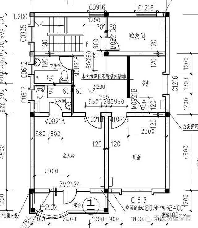 二层别墅设计图:卧室,主卧室,书房,卫生间,阳台,衣帽间,家庭室。