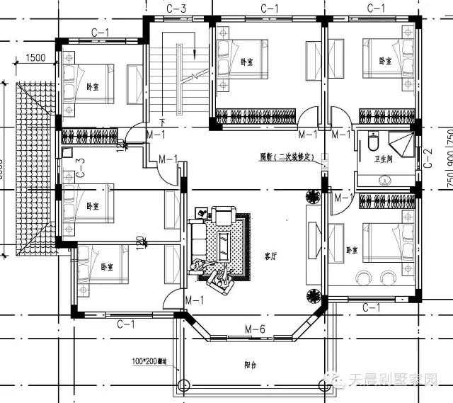 二层别墅设计图:卧室,卧室,卧室,卧室,卧室,客厅,卫生间,卧室,阳台;