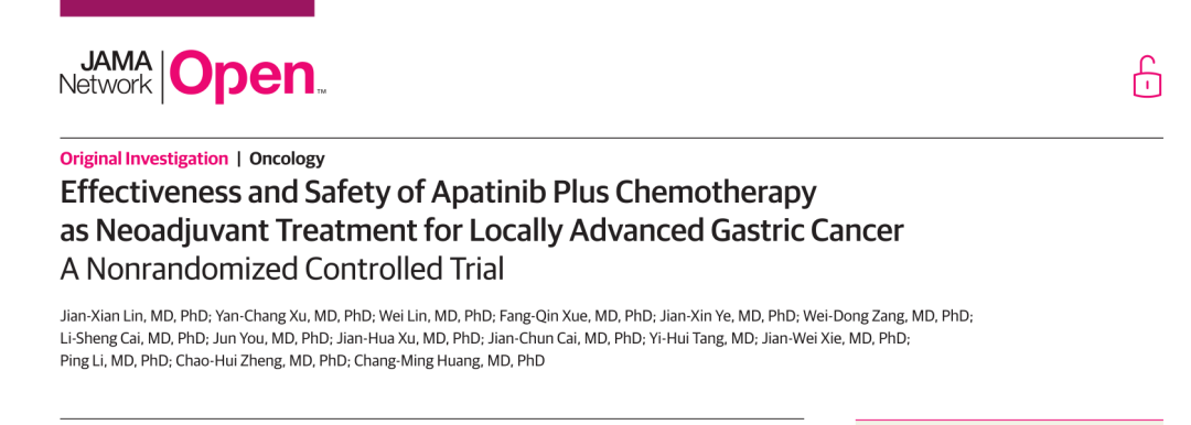 近期,福建医科大学附属协和医院胃外科黄昌明教授领衔、林建贤副主任医师为第一作者的研究团队在JAMANetwOpen发表了“阿帕替尼联合SOX新辅助治疗局部进展期胃癌”的多中心研究结果。