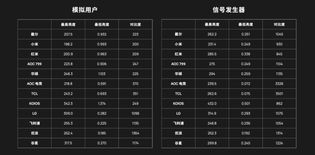 除去最下面的AOC和小米外,其他产品均达到了标称的亮度。