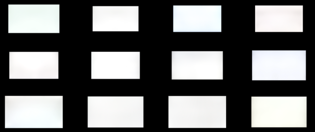 解决这个低级错误后,我们终于可以开始测试了。所有显示器统一200尼特亮度,没有说明的情况下,其他设置均保持默认状态。在显示白色的时候,12台显示器大致分成四个流派:发黄、发红、发蓝、发绿。