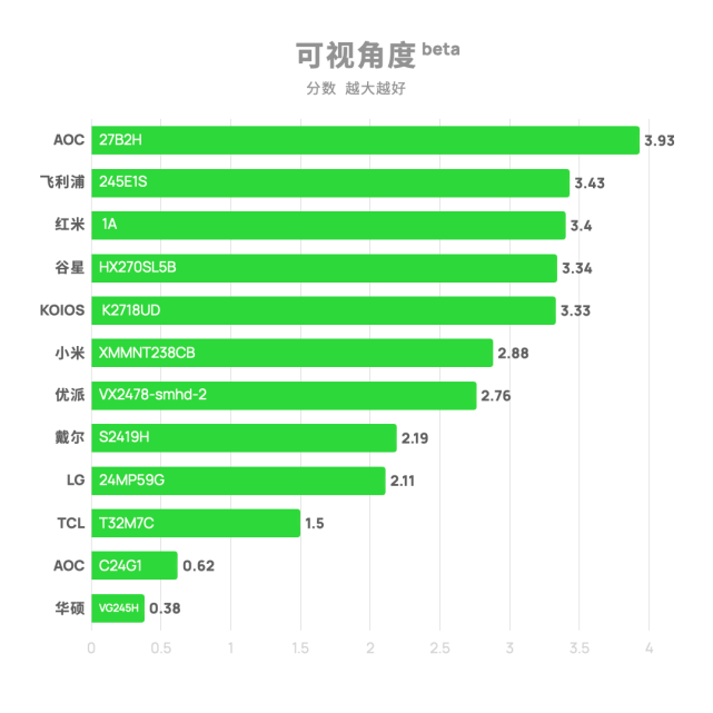 从结果来看,AOC27B2H表现最好,其实分数超过3的几款产品的可视角度都差不多。而普通人可以轻易看出AOCC24G1和华硕VG245H在不同角度下的色差。