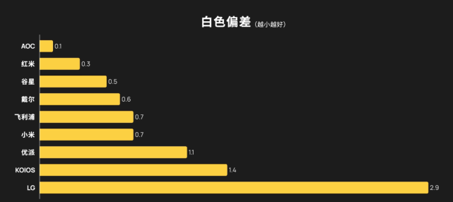 对比度外,偏色也会影响观感,我们在同种状况下测试了色偏如下。